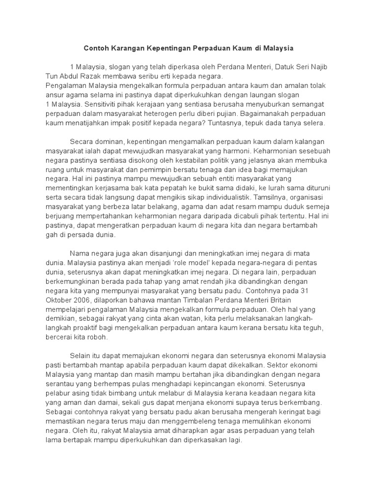 Contoh Karangan Kepentingan Perpaduan Kaum Di Malaysia Pdf